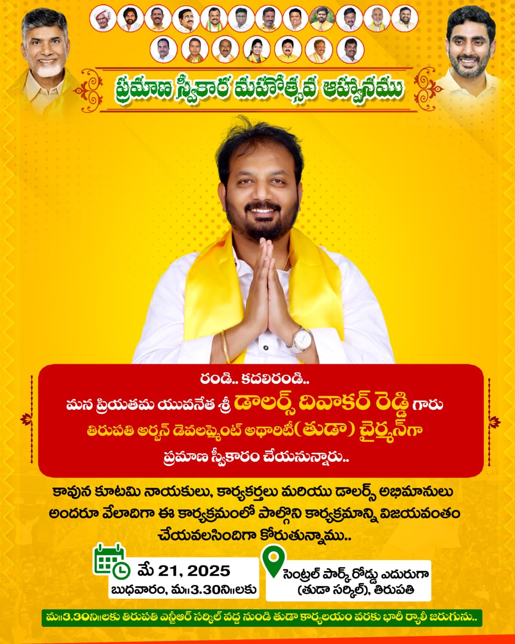 మే 21న తుడా ఛైర్మన్ గా డాలర్స్ దివాకర్ రెడ్డి ప్రమాణం!