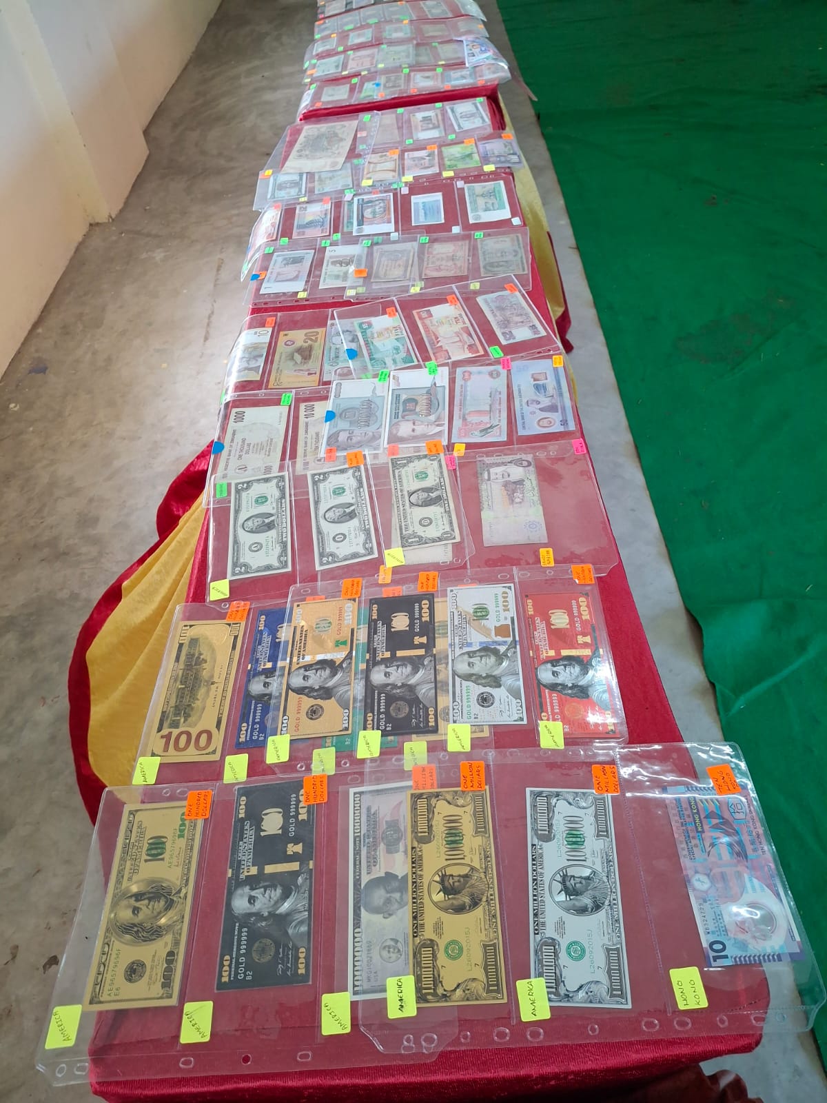 మొత్తం 204 దేశాలకు చెందిన కరెన్సీ నోట్లు, నాణేలు 100 కోట్ల డాలర్ల విలువైనవి ప్రదర్శనకు ఉంచారు. సీతారామ పట్టాభిషేకం కాలంలో తానీషా కాలంలో వాడిన 450 ఏళ్ల నాటి పంచలోహ నాణేలు, గుప్తులు, చోళులు, కాకతీయుల కాలంలో వాడిన కరెన్సీ నాణేలు, రాచముద్రలు, రిజర్వ్ బ్యాంక్ స్థాపించినప్పటి నుంచి ప్రతి యేడాది విడుదలయ్యే రూపాయి, రు. 2 నాణేలతో పాటు అణ, కాడె, బేడా లాంటి పూర్వాకాల కరెన్సీ నాణేలు, వివిధ దేశాలకు చెందిన స్టాంపులు కూడా ప్రదర్శించారు. ఇవన్నీవిద్యార్థులో ఆసక్తిని పెంచేలా ఉన్నాయి. గత 30 ఏళ్లుగా వీటిని ఎన్నో కష్టాలకోర్చి సేకరించిన ప్రిన్సిపాల్ సత్యనారాయణ మూర్తిని పలువురు అభినందించారు. ఈ కార్యక్రమాన్ని మండలంలో ప్రభుత్వ, ప్రైవేటు పాఠశాలల విద్యార్థులు, తల్లిదండ్రులు, గ్రామ ప్రజలు ఎంతో ఆసక్తిగా తిలకించారు.